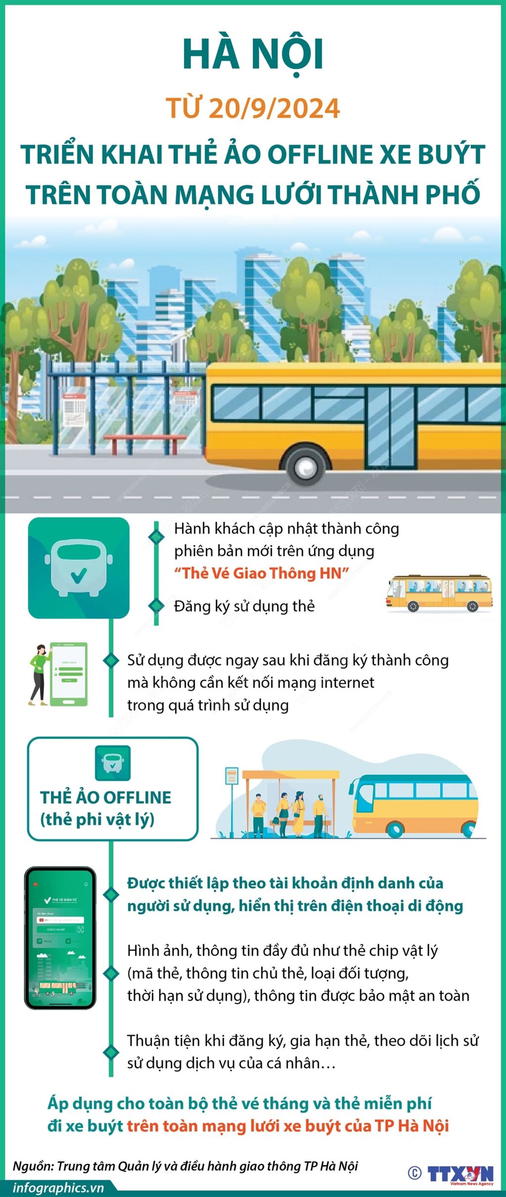 Để tạo điều kiện thuận lợi cho người dân sử dụng thẻ “ảo” (thẻ phi vật lý) tham gia giao thông công cộng kể cả khi không có mạng internet, Trung tâm Quản lý và điều hành giao thông thành phố Hà Nội triển khai thẻ “ảo”” offline áp dụng cho toàn bộ thẻ vé tháng, thẻ miễn phí trên tất cả các tuyến xe buýt có trợ giá trên toàn mạng lưới từ ngày 20/9.