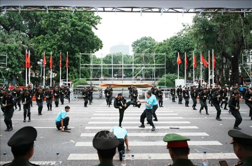 Ngoài trình diễn khí tài và phương tiện đặc chủng, các lực lượng tham gia diễu binh, diễu hành còn biểu diễn võ thuật và thực hiện tình huống giả định Công an Hà Nội ngăn chặn, bắt giữ các đối tượng gây rối trật tự công cộng.