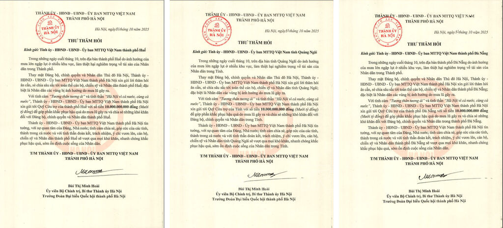 Bí thư Thành ủy Hà Nội Bùi Thị Minh Hoài viết trong thư thăm hỏi: Trong những ngày cuối tháng 10, mưa lớn gây ngập lụt ở nhiều khu vực đã làm thiệt hại nghiêm trọng về tài sản của nhân dân thành phố Huế, thành phố Đà Nẵng và tỉnh Quảng Ngãi. Thay mặt Đảng bộ, chính quyền và nhân dân Thủ đô Hà Nội, Thành ủy - HĐND - UBND - Ủy ban MTTQ Việt Nam thành phố Hà Nội gửi lời thăm hỏi ân cần, sẻ chia sâu sắc tới toàn thể cán bộ, chiến sỹ và nhân dân thành phố Huế, thành phố Đà Nẵng và tỉnh Quảng Ngãi, đặc biệt là nhân dân các vùng bị ảnh hưởng do mưa lũ gây ra.