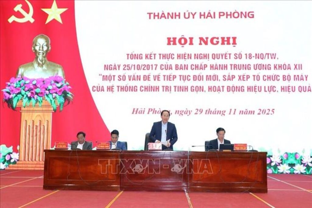 Ngày 29/11, Thành ủy Hải Phòng tổ chức Hội nghị tổng kết thực hiện Nghị quyết số 18-NQ/TW, ngày 25/10/2017 của Ban Chấp hành Trung ương khóa XII “Một số vấn đề về tiếp tục đổi mới, sắp xếp tổ chức bộ máy của hệ thống chính trị tinh gọn, hoạt động hiệu lực, hiệu quả”.