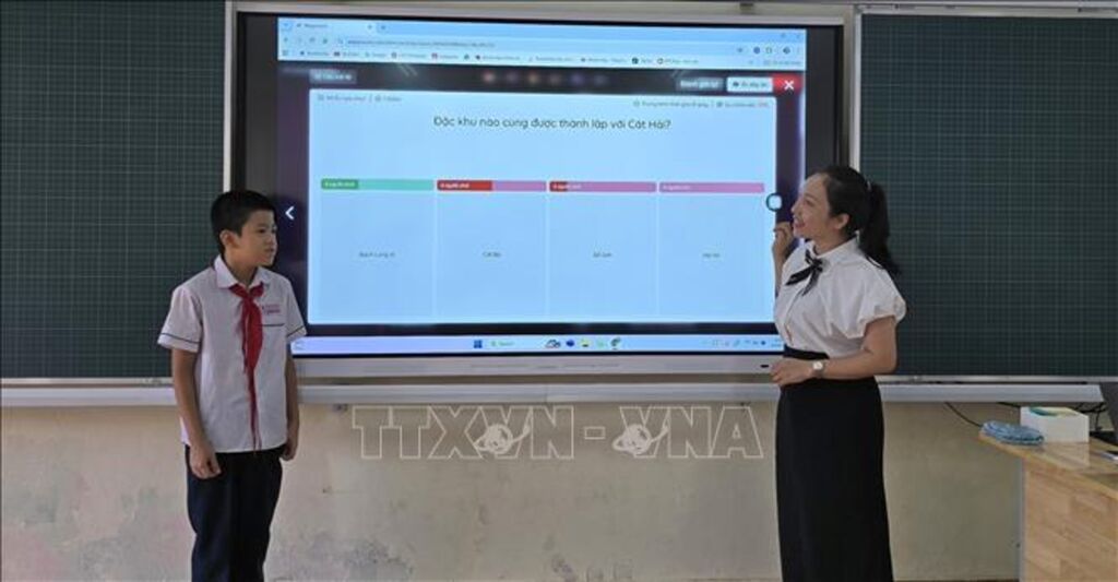 Cô Nguyễn Thị Lan Phương, giáo viên dạy lớp 5, Trường Tiểu học Nguyễn Văn Trỗi cho biết, nhà trường có phòng học thông minh trang bị đầy đủ máy tính bảng, máy chiếu, hệ thống wifi kết nối nhanh giúp cả cô, trò hào hứng để dạy và học hiệu quả hơn. Ví dụ, trước đây, việc dạy về lịch sử đặc khu Cát Hải chỉ là những hình ảnh minh họa đơn giản, cô nói, trò nghe, còn bây giờ, bài giảng rất sinh động.
