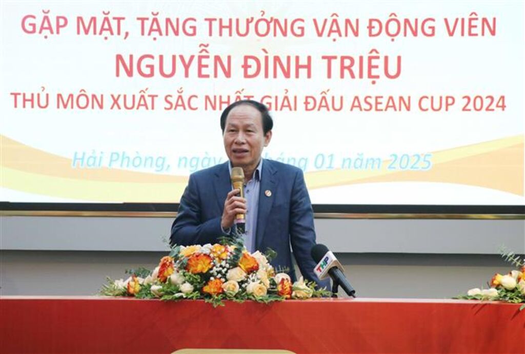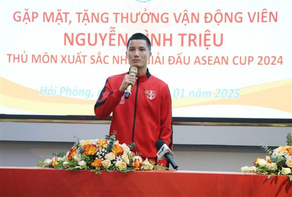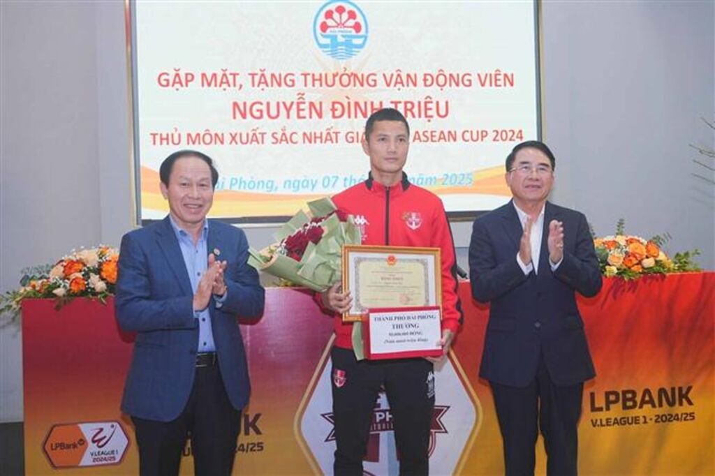 Chiều 7/1, thành phố Hải Phòng tổ chức gặp mặt, trao tặng Bằng khen và thưởng 550 triệu đồng cho thủ môn Nguyễn Đình Triệu, sau khi cùng đội tuyển Việt Nam vô địch ASEAN Cup 2024 và đoạt danh hiệu "Thủ môn xuất sắc nhất giải".