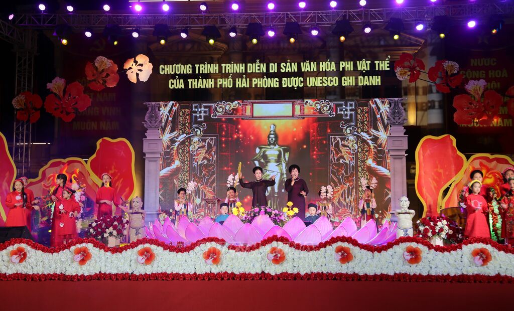 TTXVN - Tối 5/5, tại Quảng trường Nhà hát thành phố Hải Phòng diễn ra Chương trình "Trình diễn Di sản văn hóa phi vật thể của thành phố Hải Phòng được UNESCO ghi danh" .