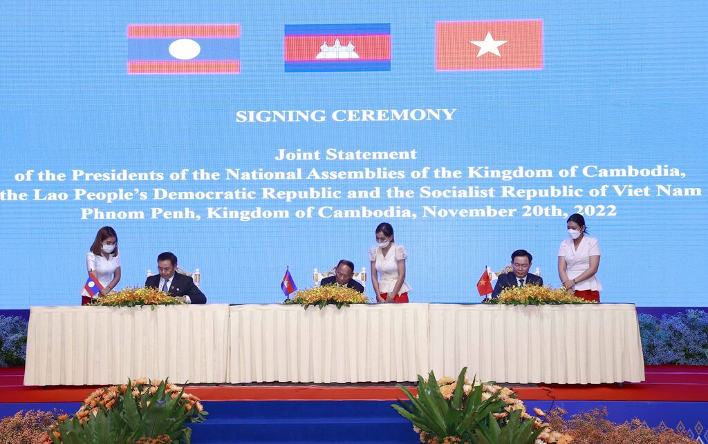 Chủ tịch Quốc hội Campuchia, Lào, Việt Nam ký Tuyên bố chung. (Ảnh: Doãn Tấn/TTXVN)