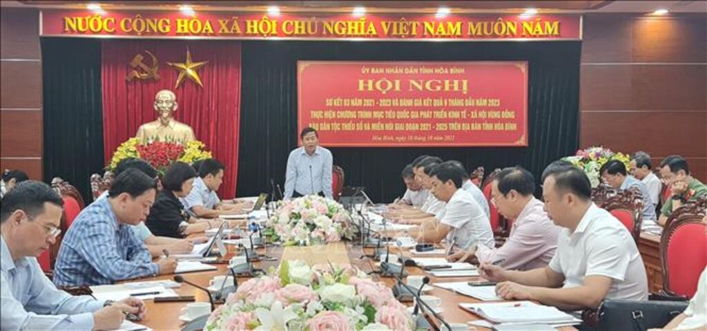 TTXVN - Chiều 18/10, UBND tỉnh Hòa Bình tổ chức Hội nghị sơ kết 3 năm và đánh giá kết quả 9 tháng năm 2023 thực hiện Chương trình mục tiêu quốc gia phát triển kinh tế - xã hội vùng đồng bào dân tộc thiểu số và miền núi giai đoạn 2021 - 2025 trên địa bàn.