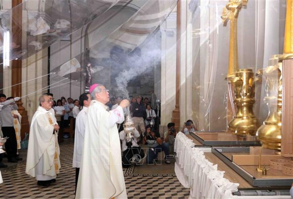 Tối 8/12, tại Nhà thờ Chính tòa Đức Bà Sài Gòn (Nhà thờ Đức Bà), Tổng Giám mục Giuse Nguyễn Năng, Tổng Giám mục Tổng Giáo phận Thành phố Hồ Chí Minh đã trang nghiêm làm phép 2 cây Thánh giá mới của Nhà thờ Đức Bà, đánh dấu cơ bản hoàn thành một trong các hạng mục quan trọng nhất của Dự án trùng tu Nhà thờ Đức Bà.