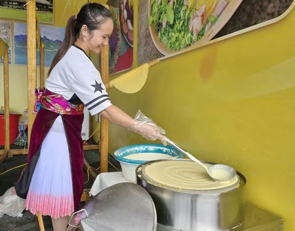 Nếu yêu thích món vịt quay Cao Bằng, du khách có có thể thưởng thức hương vị thơm ngon, đậm đà tại khu vực "Thu mỹ vị". Bên cạnh đó, bánh cuốn Cao Bằng cũng là món nhất định phải thử - bánh được tráng tay tại chỗ, nóng hổi, ăn kèm nước dùng ninh từ xương ngọt thanh.