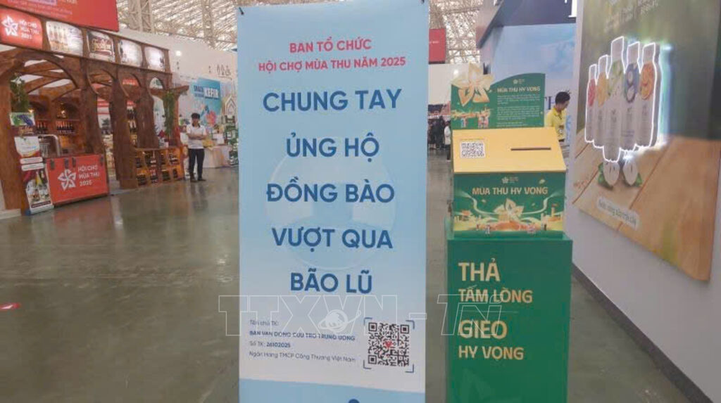 Ngoài tài khoản và QR quyên góp do Ủy ban Trung ương Mặt trận Tổ quốc Việt Nam khởi tạo riêng cho Hội chợ Mùa Thu 2025 được công bố công khai, Ban Tổ chức còn bố trí các hòm từ thiện tại 8 cửa vào Trung tâm Hội chợ, tạo điều kiện để du khách, doanh nghiệp, người dân trực tiếp đóng góp tiền mặt.