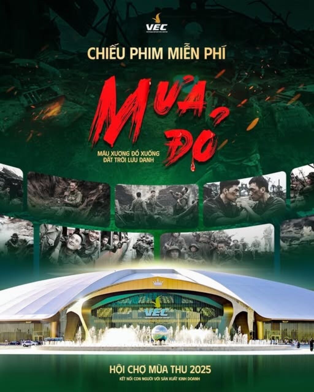 Cục Điện ảnh (Bộ Văn hóa, Thể thao và Du lịch) cho biết, trong khuôn khổ Hội chợ mùa Thu 2025, diễn ra từ ngày 25/10 đến 4/11 tại Nhà triển lãm Kim Quy, Trung tâm Hội chợ Triển lãm Quốc gia (Đông Anh, Hà Nội), khán giả sẽ có cơ hội xem miễn phí hai bộ phim “Mưa đỏ” và “Tử chiến trên không” - những tác phẩm điện ảnh nổi bật của Việt Nam thời gian gần đây.