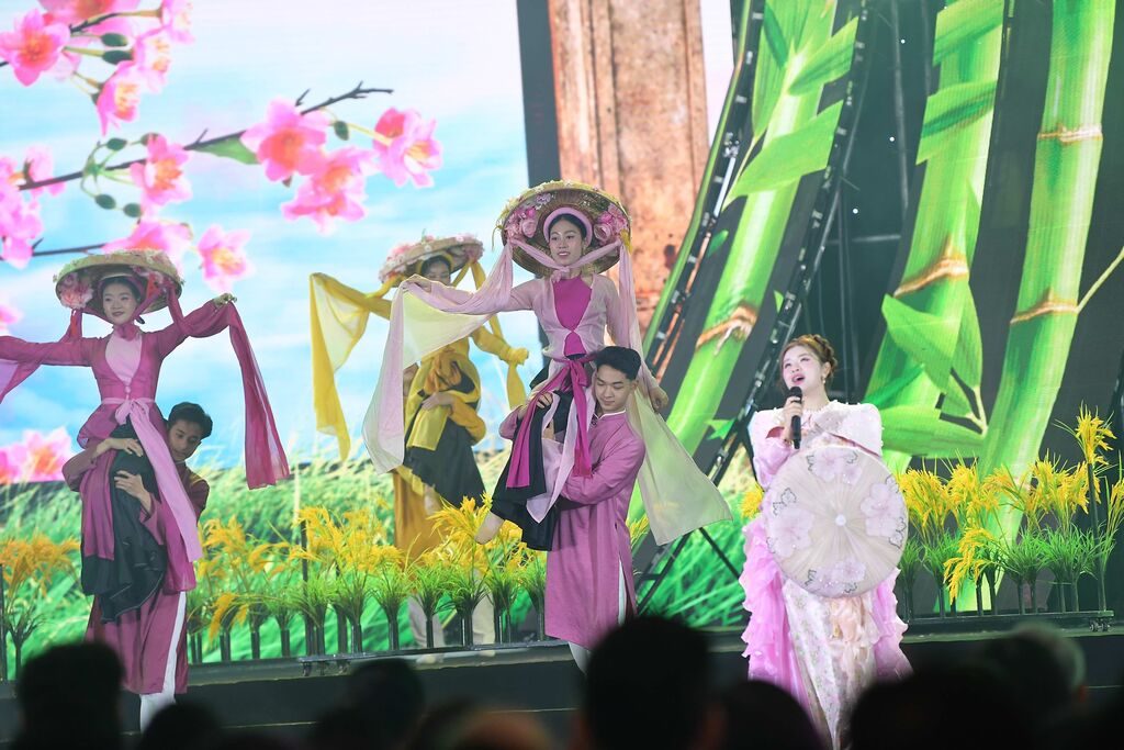 Không gian nghệ thuật tiếp nối với hoạt cảnh “Mùa Xuân làng lúa làng hoa”, tái hiện vẻ đẹp của bức tranh làng quê mang đậm nét văn hóa vùng đồng bằng Bắc Bộ, qua hình ảnh tà áo tứ thân, nón quai thao kết hoa.