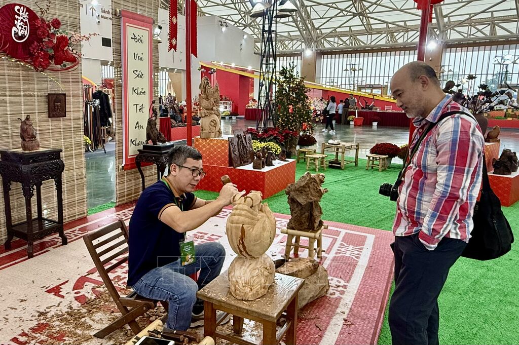 Không dừng lại ở việc trưng bày sản phẩm, nghệ nhân Phạm Văn Vững còn trực tiếp cầm đục, cầm dùi, trình diễn những đường chạm tinh xảo ngay tại gian hàng. Nhiều khách tham quan say mê đứng xem, có người hào hứng đề nghị được thử đục tượng gỗ, để trải nghiệm từng nhịp đục của người thợ. Nghệ nhân Phạm Văn Vững chia sẻ, việc đưa nghề truyền thống đến với không gian hội chợ vừa để giới thiệu và bán sản phẩm, cũng vừa để “nuôi dưỡng” tình yêu nghề và gieo mầm đam mê cho thế hệ trẻ.