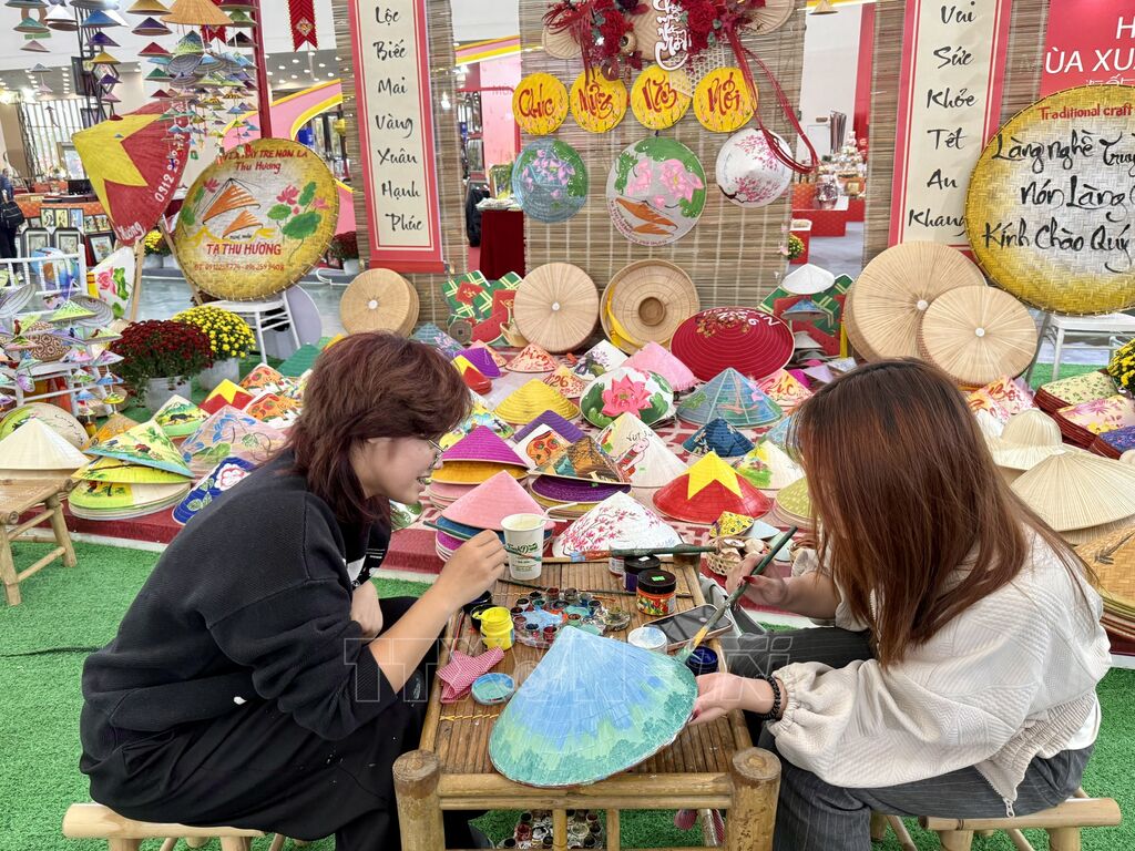 Ở một góc khác của hội chợ, gian trưng bày nón làng Chuông (Thanh Oai, Hà Nội) lại mang đến sắc thái mềm mại, duyên dáng với những chiếc nón lá truyền thống. Nghệ nhân làm nón Phạm Thị Vấn cho biết, bên cạnh dòng nón cổ truyền, năm nay gia đình chị còn mang đến hội chợ những mẫu nón được trang trí cách điệu để kết hợp áo dài, cũng như các mẫu nón trang trí phục vụ không gian Tết. Tại hội chợ, các nghệ nhân không chỉ bán nón, mà còn giới thiệu với du khách cả quy trình làm nón, để du khách vừa tìm hiểu từng công đoạn của làm nón, từ chẻ nan, là lá đến khâu nón. Các bạn trẻ còn được vẽ sáng tạo trên nón, hoặc tự tay thực hành những bước cơ bản…