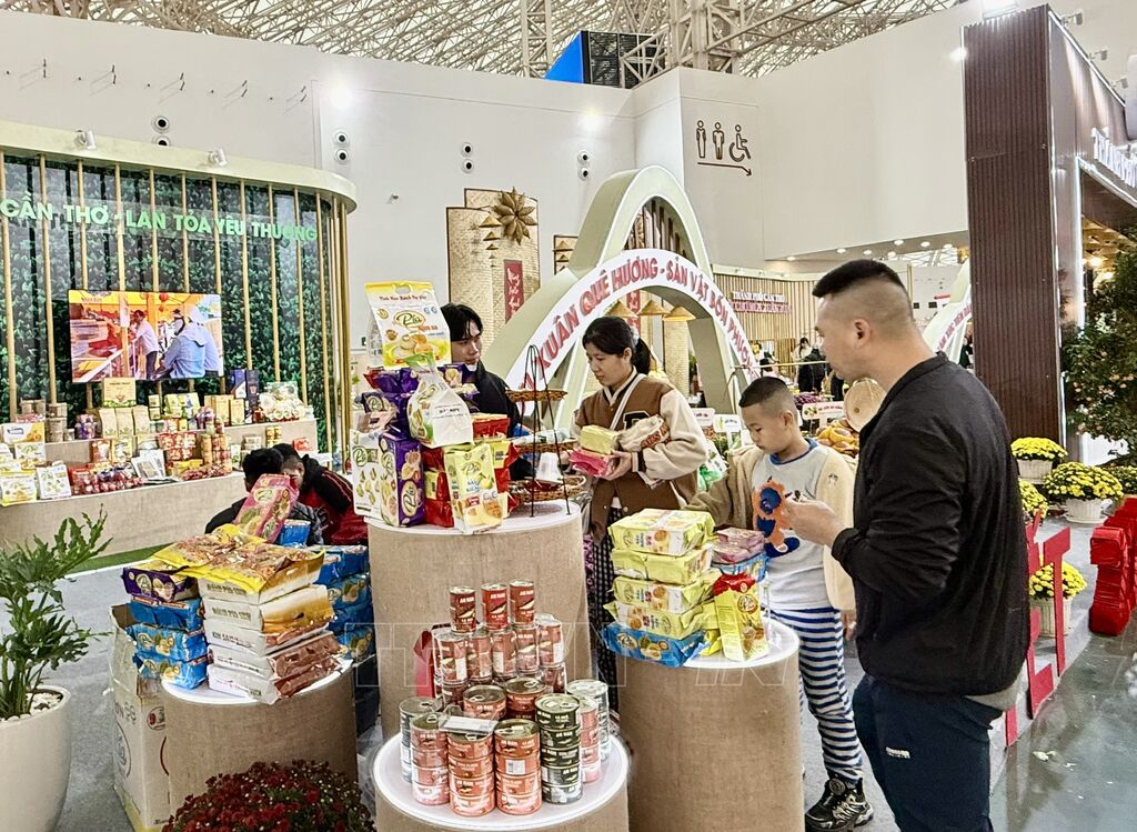 Điểm nhấn đặc biệt của gian hàng Cần Thơ là khu “Không gian vị Tết xưa”, tái hiện sinh động không khí Tết truyền thống miền Nam qua việc trang trí câu đối đỏ, bánh tét, tràng pháo, đôi quang gánh, hoa mai, hoa cúc, mâm ngũ quả… Sự kết hợp giữa yếu tố thương mại và văn hóa đã giúp gian hàng trở nên gần gũi, sinh động, giàu cảm xúc, thu hút đông đảo khách tham quan.