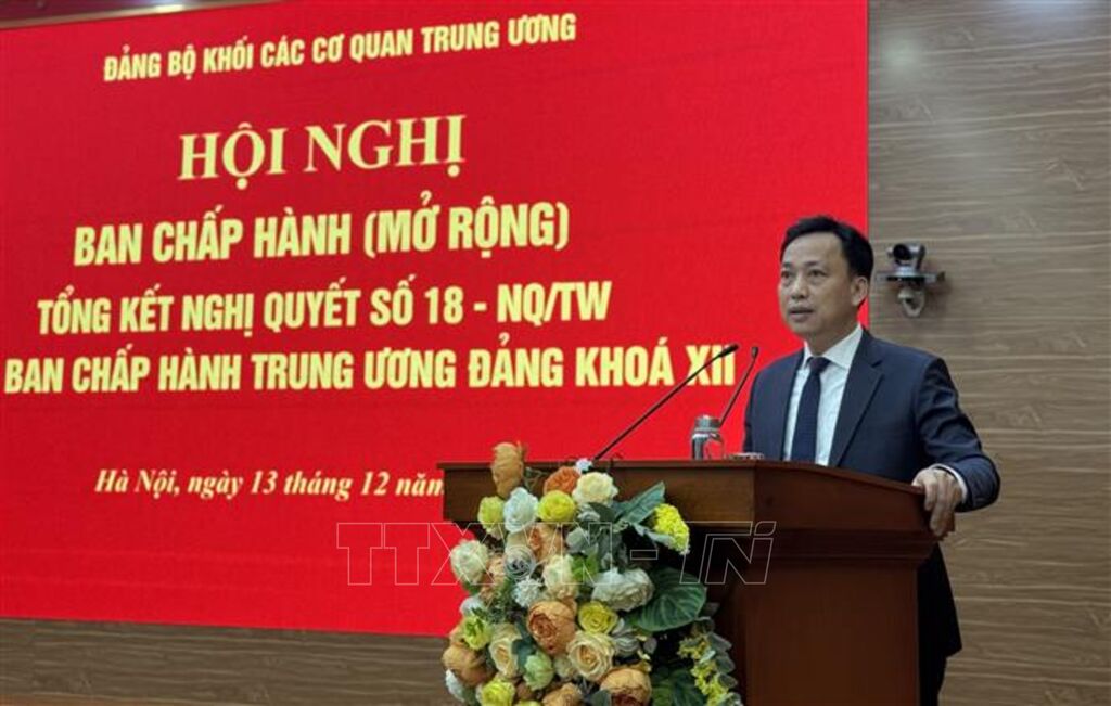 Sáng 13/12, tại Hà Nội, Đảng bộ Khối các cơ quan Trung ương tổ chức Hội nghị Ban Chấp hành mở rộng tổng kết Nghị quyết số 18-NQ/TW, ngày 25/10/2017 của Ban Chấp hành Trung ương Đảng khóa XII "Một số vấn đề về tiếp tục đổi mới, sắp xếp tổ chức bộ máy của hệ thống chính trị tinh gọn, hoạt động hiệu lực, hiệu quả".