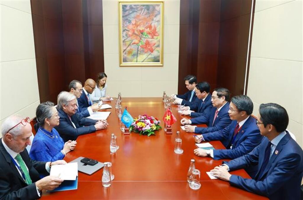 Tại cuộc gặp, Thủ tướng Phạm Minh Chính chúc mừng thành công tốt đẹp của Hội nghị Thượng đỉnh Tương lai vừa được tổ chức tại New York (Mỹ); đánh giá cao vai trò của Tổng Thư ký và các cơ quan LHQ trong gìn giữ hoà bình, ổn định, thu hẹp khoảng cách và thúc đẩy phát triển trên toàn cầu; cảm ơn sự hợp tác, hỗ trợ quý báu của Liên hợp quốc đối với công cuộc Đổi mới, phát triển của Việt Nam gần 40 năm qua.