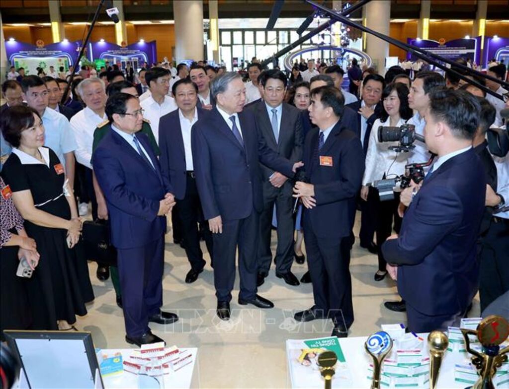 Trước khi tham dự Hội nghị, tại điểm cầu chính Nhà Quốc hội, các đại biểu đã tham quan triển lãm những thành tựu nổi bật trong lĩnh vực y tế và lĩnh vực giáo dục.