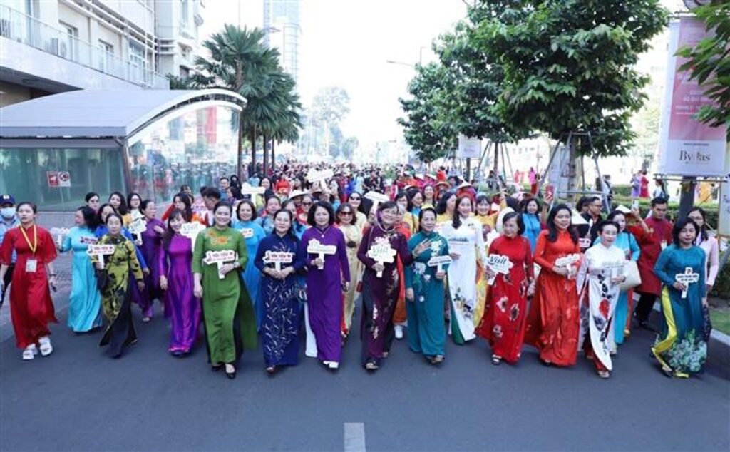 TTXVN - Ngày 5/3, tại phố đi bộ Nguyễn Huệ (Quận 1), Hội Liên hiệp Phụ nữ Thành phố Hồ Chí Minh tổ chức chương trình họp mặt kỷ niệm 113 năm Ngày Quốc tế Phụ nữ 8/3 và 1983 năm Cuộc khởi nghĩa Hai Bà Trưng, diễu hành áo dài với chủ đề “Tôi yêu áo dài Việt Nam”.