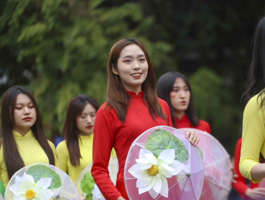 Người dân và du khách đặc biệt thích thú với chương trình đồng diễn và diễu hành áo dài của Hội Liên hiệp Phụ nữ thành phố Hà Nội với quy mô gần 1.000 người tham gia.