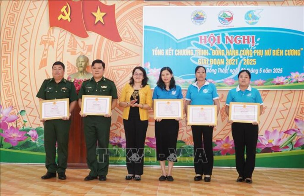 Dịp này, đại diện nhiều cơ quan, đơn vị trao bảng tượng trưng ủng hộ Chương trình “Đồng hành cùng phụ nữ biên cương” trị giá hơn 130 triệu đồng; tặng quà cho hội viên, phụ nữ có hoàn cảnh khó khăn và học bổng cho học sinh vượt khó học tốt. Nhiều tập thể, cá nhân có đóng góp tích cực trong thực hiện Chương trình “Đồng hành cùng phụ nữ biên cương” giai đoạn 2021 - 2025 nhận Bằng khen của Chủ tịch UBND tỉnh Đồng Tháp, Bằng khen của Ban Thường vụ Hội Liên hiệp Phụ nữ tỉnh và Bộ Chỉ huy Bộ đội Biên phòng tỉnh Đồng Tháp.