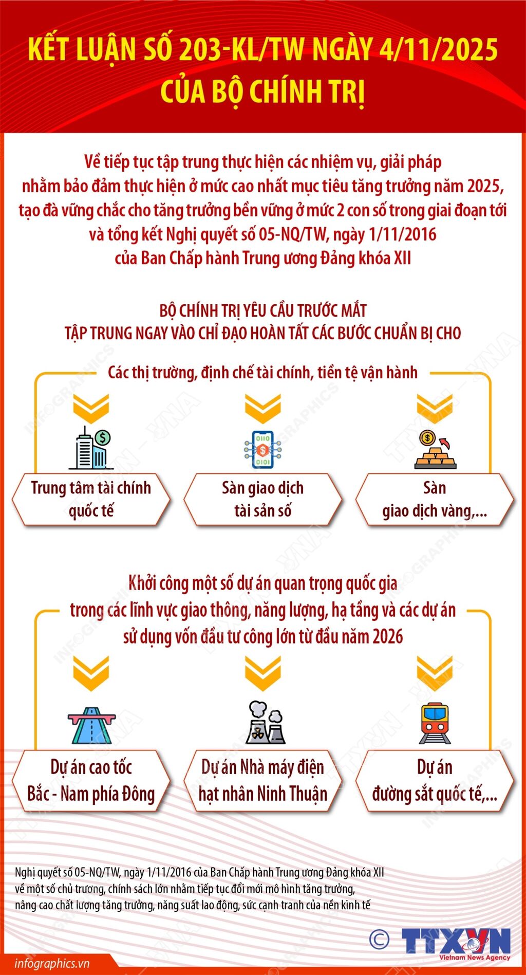 Tại Kết luận số 203-KL/TW của Bộ Chính trị ngày 4/11/2025 về tiếp tục tập trung thực hiện các nhiệm vụ, giải pháp nhằm bảo đảm thực hiện ở mức cao nhất mục tiêu tăng trưởng năm 2025, tạo đà vững chắc cho tăng trưởng bền vững ở mức 2 con số trong giai đoạn tới và tổng kết Nghị quyết số 05-NQ/TW, ngày 1/11/2016 của Ban Chấp hành Trung ương Đảng khóa XII, Bộ Chính trị yêu cầu trước mắt tập trung ngay vào chỉ đạo hoàn tất các bước chuẩn bị cho các thị trường, định chế tài chính, tiền tệ vận hành (Trung tâm tài chính quốc tế; Sàn giao dịch tài sản số; Sàn giao dịch vàng,...); Khởi công một số dự án quan trọng quốc gia trong các lĩnh vực giao thông, năng lượng, hạ tầng và các dự án sử dụng vốn đầu tư công lớn (Dự án cao tốc Bắc - Nam phía Đông; Dự án Nhà máy điện hạt nhân Ninh Thuận; Dự án đường sắt quốc tế,...) từ đầu năm 2026.