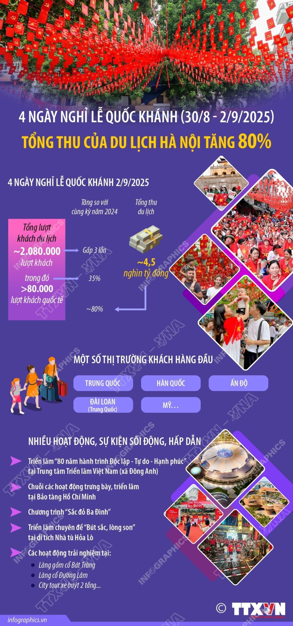 Thông tin từ Sở Du lịch Hà Nội cho biết, trong 4 ngày nghỉ Lễ Quốc khánh (từ 30/8 đến 2/9/2025), Thủ đô đón khoảng 2,08 triệu lượt khách, gấp 3 lần so với cùng kỳ năm trước. Trong đó khách quốc tế ước đón trên 80.000 lượt, tăng 35% so với cùng kỳ năm 2024. Tổng thu từ du lịch đạt khoảng 4.500 tỷ đồng, tăng 80% so với năm 2024.