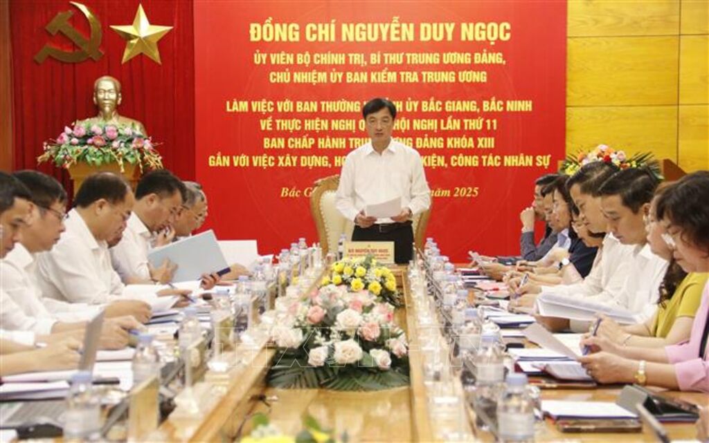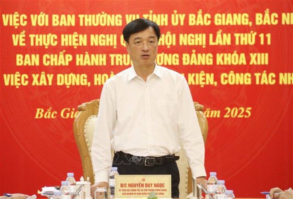Ngày 31/5, tại Tỉnh ủy Bắc Giang, Ủy viên Bộ Chính trị, Bí thư Trung ương Đảng, Chủ nhiệm Ủy ban Kiểm tra Trung ương Nguyễn Duy Ngọc đã làm việc với Ban Thường vụ Tỉnh ủy hai tỉnh Bắc Giang, Bắc Ninh về việc thực hiện Nghị quyết Hội nghị lần thứ 11 của Ban Chấp hành Trung ương Đảng khóa XIII gắn với xây dựng, hoàn thiện văn kiện, công tác nhân sự.