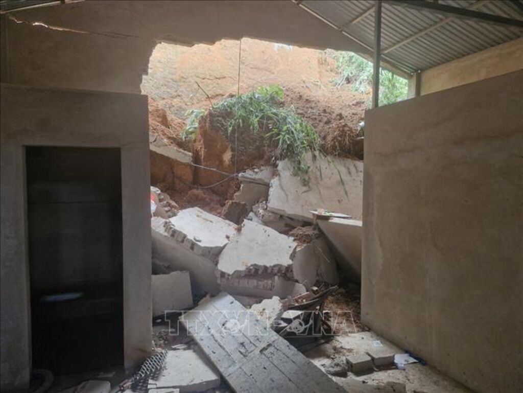 Mưa lớn gây sạt lở đất làm đổ tường nhà của hộ dân ở xã Búng Lao, huyện Mường Ảng.