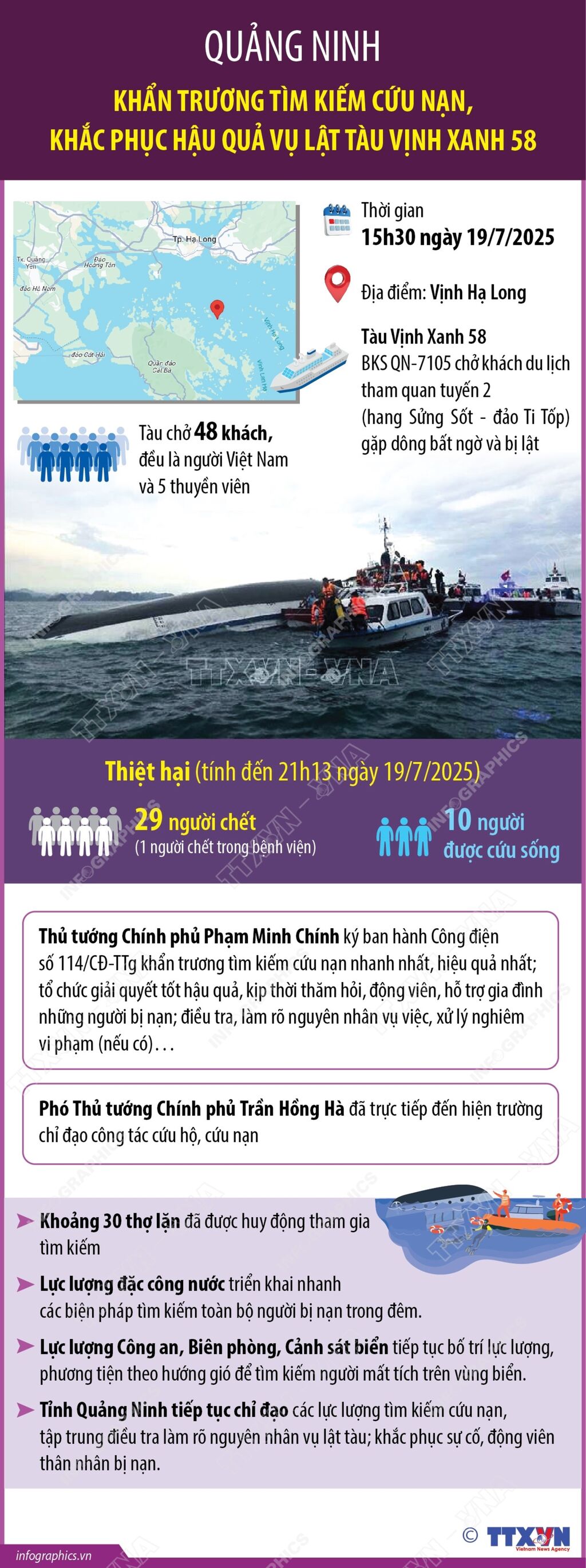Thực hiện chỉ đạo của Thủ tướng Chính phủ, Phó Thủ tướng Chính phủ và lãnh đạo tỉnh Quảng Ninh, hiện công tác cứu hộ cứu nạn vụ việc đắm tàu du lịch trên Vịnh Hạ Long vẫn đang rất khẩn trương. Khoảng 30 thợ lặn đã được huy động tham gia tìm kiếm.