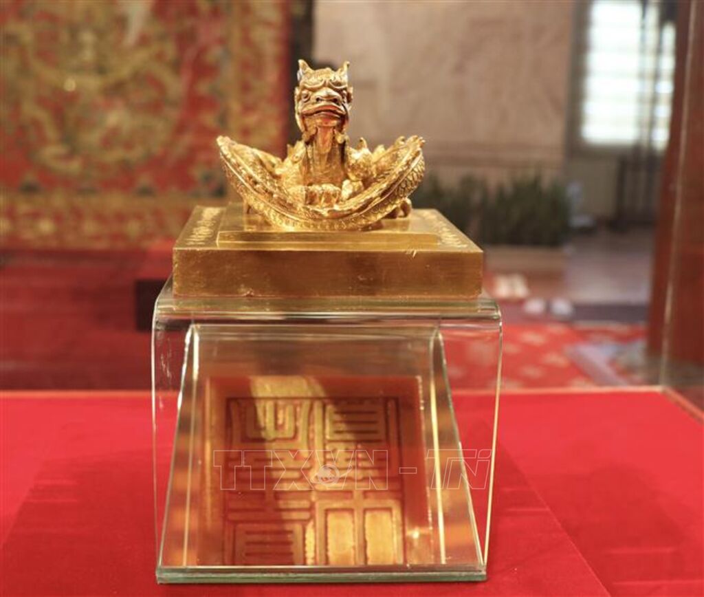 Theo tài liệu của Sở Văn hóa, Thể thao và Du lịch tỉnh Bắc Ninh, ấn vàng được đúc vào tháng 3/1923, niên hiệu Minh Mệnh 4. Trải qua thời gian, ngày 30/8/1945, khi tuyên bố thoái vị, vua Bảo Đại đã chọn chiếc ấn đẹp nhất, quý nhất, biểu trưng của chế độ quân chủ thời Nguyễn là Ấn vàng “Hoàng đế chi bảo” cùng thanh bảo kiếm mà “phụ vương” của ông (là vua Khải Định trao lại) để bàn giao cho chính quyền cách mạng tại sân Ngọ Môn.