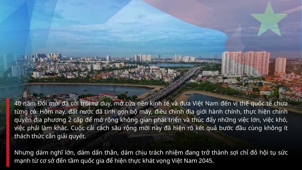 40 năm Đổi mới đã đi qua. Từ những ước mơ rất nhỏ, hôm nay đất nước bước vào các động lực tăng trưởng mới với trí tuệ nhân tạo, nông nghiệp công nghệ cao, chuyển đổi số, chuyển đổi xanh... Chặng đường sánh vai các cường quốc còn nhiều việc khó, nhưng tín hiệu mới đang mở ra. Từ làng quê tới đô thị, từ những con người bình dị, khát vọng 2045 hoàn toàn có cơ sở thành hiện thực.