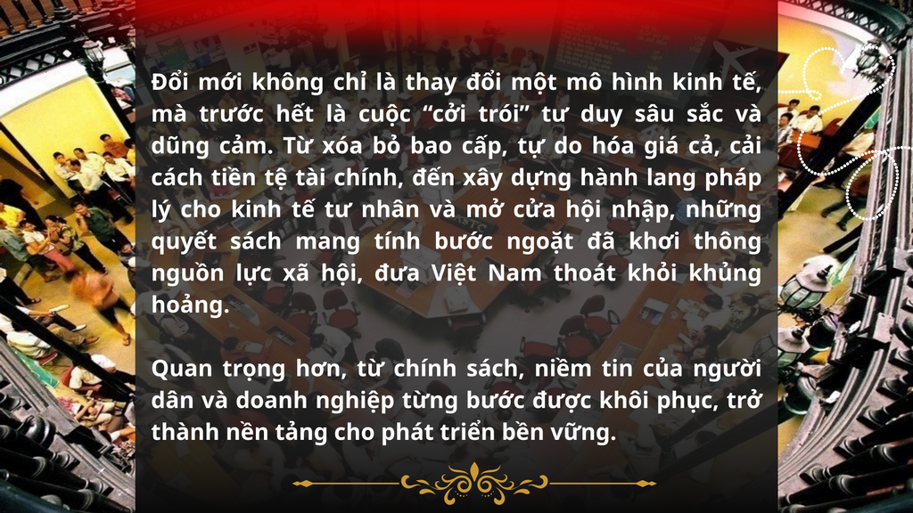 Nhưng cú hích thực sự tạo dựng niềm tin lại đến từ nông nghiệp. Nghị quyết 10-NQ/TW năm 1988 của Bộ Chính trị, hay còn gọi là Khoán 10, đã trao quyền sử dụng đất lâu dài cho nông dân, xác lập họ là chủ thể sản xuất. Khi được giải phóng, sức sản xuất nông nghiệp bùng nổ, sản lượng lương thực tăng vọt, đưa Việt Nam từ thiếu đói đã có thặng dư và vươn lên nhóm quốc gia xuất khẩu gạo hàng đầu.