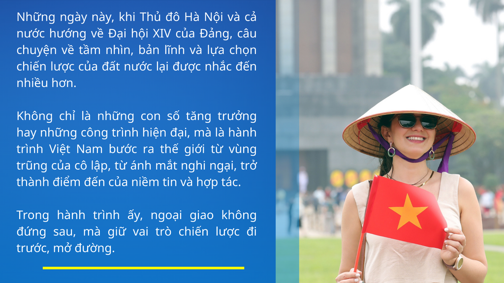 Sự “kinh ngạc” ấy không đến từ phép màu. Đó là kết quả của một lựa chọn sinh tử mà Đảng Cộng sản Việt Nam đã quyết định tại Đại hội lần thứ VI: Đổi mới. Trong tổng thể công cuộc Đổi mới ấy, ngoại giao đảm nhận vai trò chiến lược: Đi trước, mở đường, phá thế bao vây cấm vận, mở ra cục diện đối ngoại thuận lợi cho xây dựng và bảo vệ Tổ quốc “từ sớm, từ xa”, tạo dựng môi trường hòa bình, ổn định để phát triển.