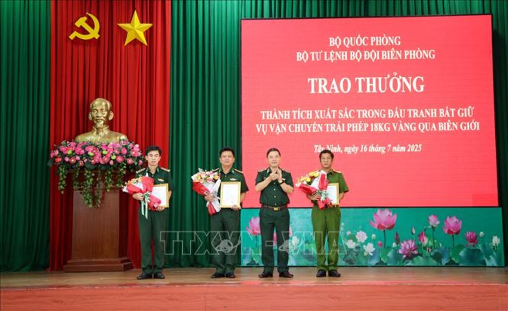 Ngày 16/7, Ban Chỉ huy Bộ đội Biên phòng tỉnh Tây Ninh (thuộc Bộ Chỉ huy Quân sự tỉnh) tổ chức Lễ trao thưởng thành tích xuất sắc cho lực lượng tham gia bắt giữ vụ vận chuyển trái phép 18kg vàng từ Campuchia qua biên giới vào Việt Nam.