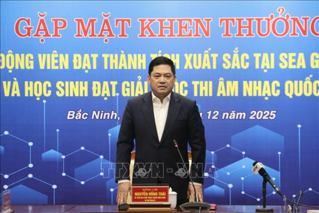 Sáng 31/12, Bí thư Tỉnh ủy Bắc Ninh Nguyễn Hồng Thái, Chủ tịch UBND tỉnh Bắc Ninh Phạm Hoàng Sơn dự cuộc gặp mặt, khen thưởng các vận động viên, nghệ sĩ trẻ đạt thành tích xuất sắc tại SEA Games 33 và các cuộc thi âm nhạc quốc tế do UBND tỉnh Bắc Ninh tổ chức.