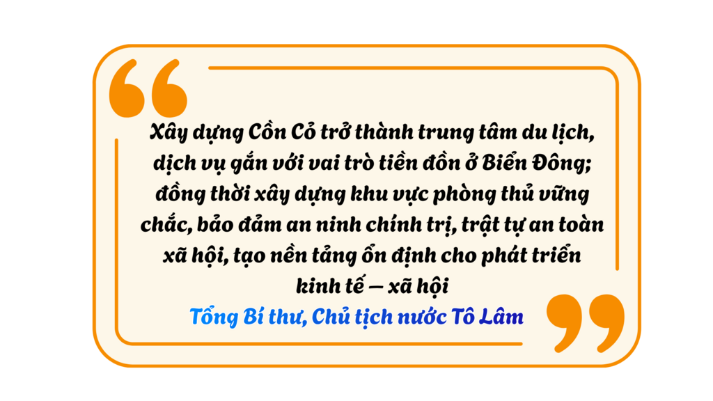 Trong chuyến thăm, khảo sát đảo Cồn Cỏ vào tháng 10/2024, Tổng Bí thư, Chủ tịch nước Tô Lâm đã nhấn mạnh một định hướng lớn: Xây dựng hòn đảo tiền tiêu này trở thành trung tâm du lịch, dịch vụ gắn với vai trò tiền đồn vững chắc trên Biển Đông.