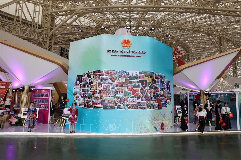 Thiết kế theo hình dáng một bông hoa sen với 6 cánh cách điệu trên tổng diện tích 400m2, không gian trưng bày của Bộ Dân tộc và Tôn giáo được chia thành 4 khu. Đó là khu giới thiệu chung với chủ đề “Việt Nam đa sắc - đồng lòng”; khu công tác dân tộc với chủ đề “Lịch sử hào hùng, khát vọng vươn mình”; khu công tác tôn giáo với chủ đề “Tín ngưỡng, tôn giáo đồng hành cùng sự phát triển của đất nước”. Khu về chương trình xóa nhà tạm, nhà dột nát với chủ đề “Mái ấm cho đồng bào tôi: Chủ trương lớn, hành động nhanh, hoàn thành sớm”. Đặc biệt, gian hàng có sự xuất hiện của 2 robot mặc trang phục dân tộc, nói tiếng dân tộc (tiếng Kinh, Tày, M’Nông, Bahnar, Ê-Đê, Chăm, Khmer…) và cả ngoại ngữ khi tiếp khách đến thăm.