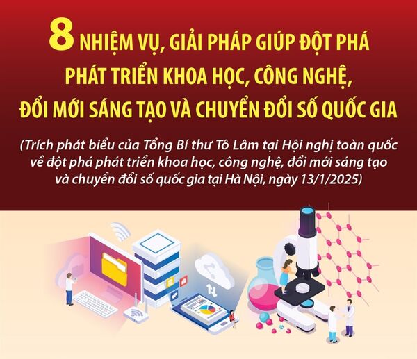 Phát biểu tại Hội nghị toàn quốc về đột phá phát triển khoa học, công nghệ, đổi mới sáng tạo và chuyển đổi số quốc gia tại Hà Nội, ngày 13/1/2025, Tổng Bí thư Tô Lâm đề nghị và nhấn mạnh 8 nhiệm vụ, giải pháp. -