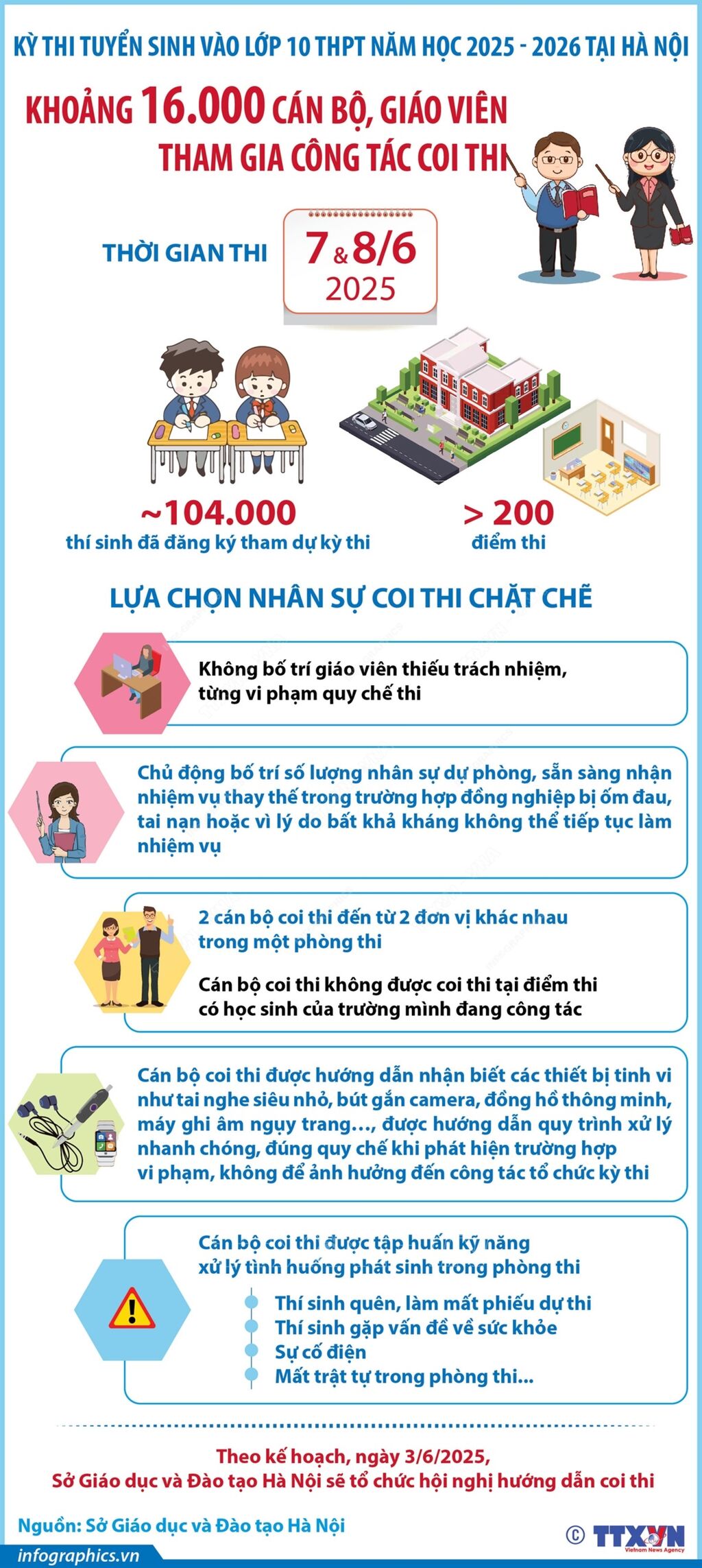 Trong hai ngày 7 và 8/6/2025, Hà Nội sẽ diễn ra kỳ thi tuyển sinh vào lớp 10 THPT công lập năm học 2025-2026 với sự tham gia của gần 104.000 thí sinh. Với quy mô lớn, tính chất cạnh tranh cao, Sở Giáo dục và Đào tạo Hà Nội dự kiến điều động khoảng 16.000 cán bộ, giáo viên tham gia công tác coi thi tại hơn 200 điểm thi.