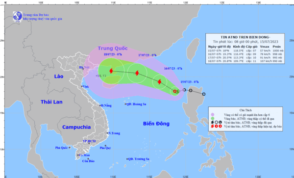 TTXVN - Nhận định về diễn biến bão số 1, Trưởng Phòng Dự báo thời tiết, Trung tâm Dự báo khí tượng thủy văn Quốc gia Nguyễn Văn Hưởng cho biết, sáng 16/7, vị trí tâm bão ở vào khoảng 19,0 độ Vĩ Bắc; 116,3 độ Kinh Đông, cách bán đảo Lôi Châu (Trung Quốc) khoảng 670km về phía Đông Đông Nam. Sức gió mạnh nhất vùng gần tâm bão mạnh cấp 9-10 (75-102km/giờ), giật cấp 13.