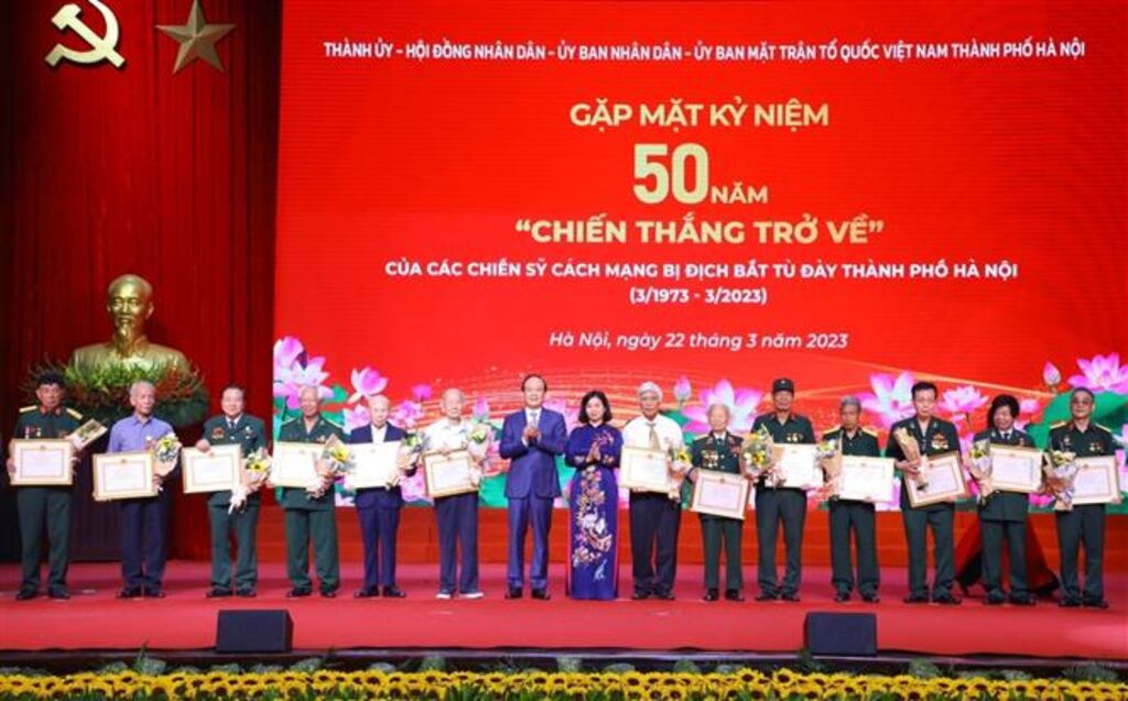 TTXVN - Sáng 22/3, thành phố Hà Nội tổ chức gặp mặt kỷ niệm 50 năm "Chiến thắng trở về" của các chiến sỹ cách mạng bị địch bắt tù đày thành phố Hà Nội.