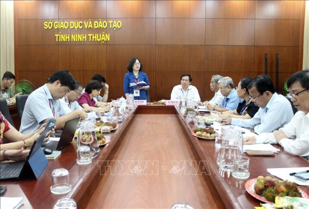 TTXVN - Chiều 8/6, Đoàn công tác do bà Ngô Thị Minh, Thứ trưởng Bộ Giáo dục và Đào tạo, Phó trưởng Ban Chỉ đạo cấp quốc gia Kỳ thi tốt nghiệp Trung học Phổ thông năm 2023 làm Trưởng đoàn, đã làm việc với Ban Chỉ đạo các kỳ thi năm 2023 tỉnh Ninh Thuận về công tác chuẩn bị, tổ chức Kỳ thi tốt nghiệp Trung học Phổ thông năm 2023.