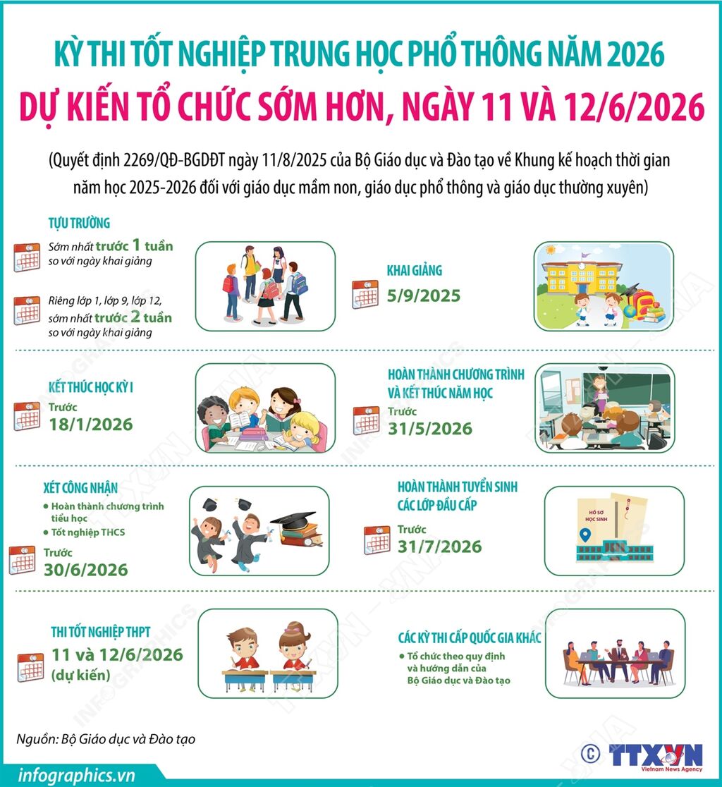 Lễ khai giảng diễn ra vào ngày 5/9/2025. Kỳ thi tốt nghiệp Trung học Phổ thông năm 2026 dự kiến diễn ra trong ngày 11 và 12/6/2026. Việc dự kiến tổ chức sớm hơn kỳ thi phù hợp với khung kế hoạch năm học, học sinh vẫn có thời gian để ôn thi./.