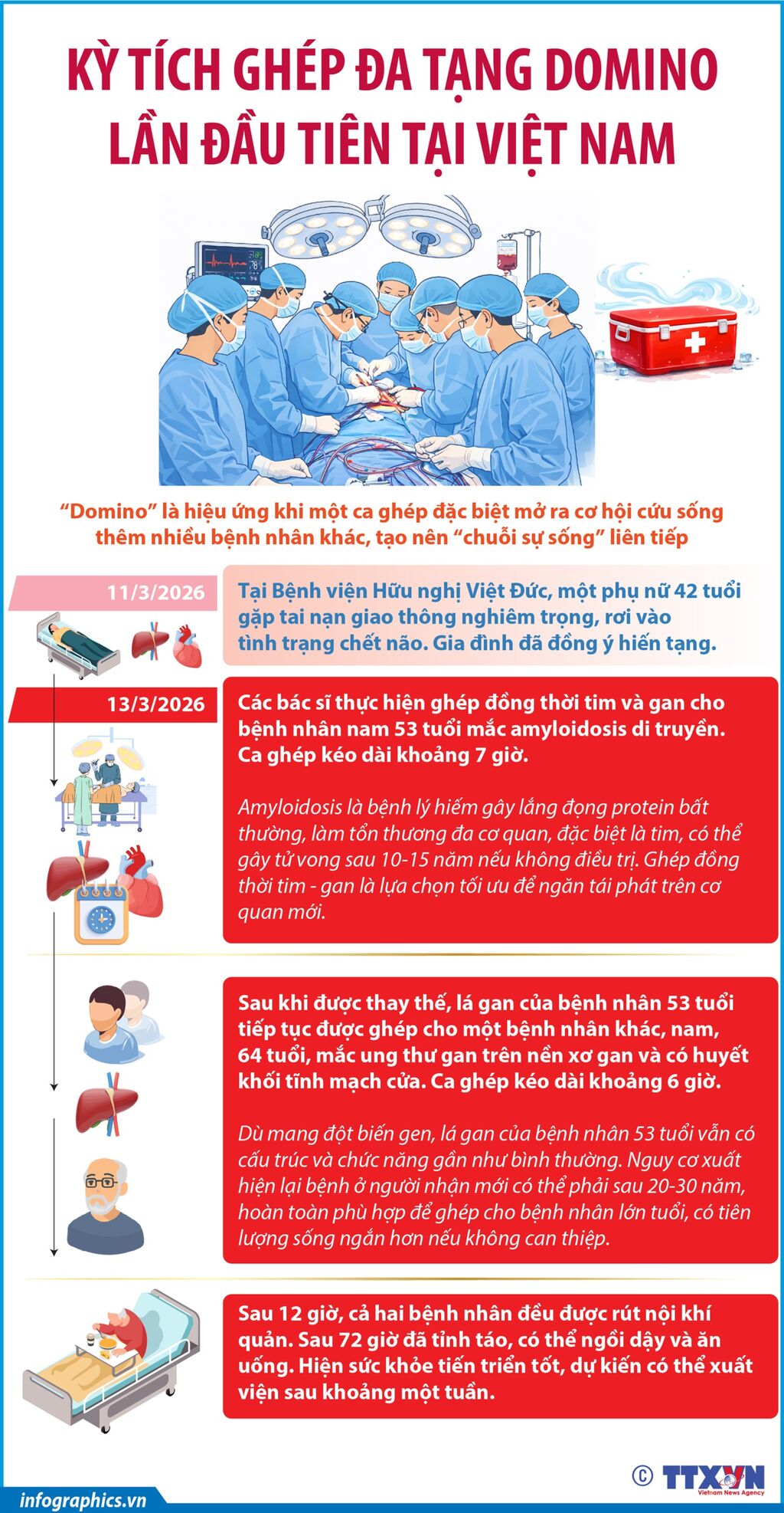Sáng 19/3/2026, tại Hà Nội, Cục Quản lý khám, chữa bệnh (Bộ Y tế), Bệnh viện Hữu nghị Việt Đức đã thông tin về ca ghép đa tạng domino lần đầu tiên Việt Nam, đánh dấu bước tiến quan trọng của lĩnh vực ghép tạng trong nước. Theo PGS.TS Dương Đức Hùng, Giám đốc Bệnh viện Hữu nghị Việt Đức, “Domino” là hiệu ứng khi một ca ghép đặc biệt mở ra cơ hội cứu sống thêm nhiều bệnh nhân khác.