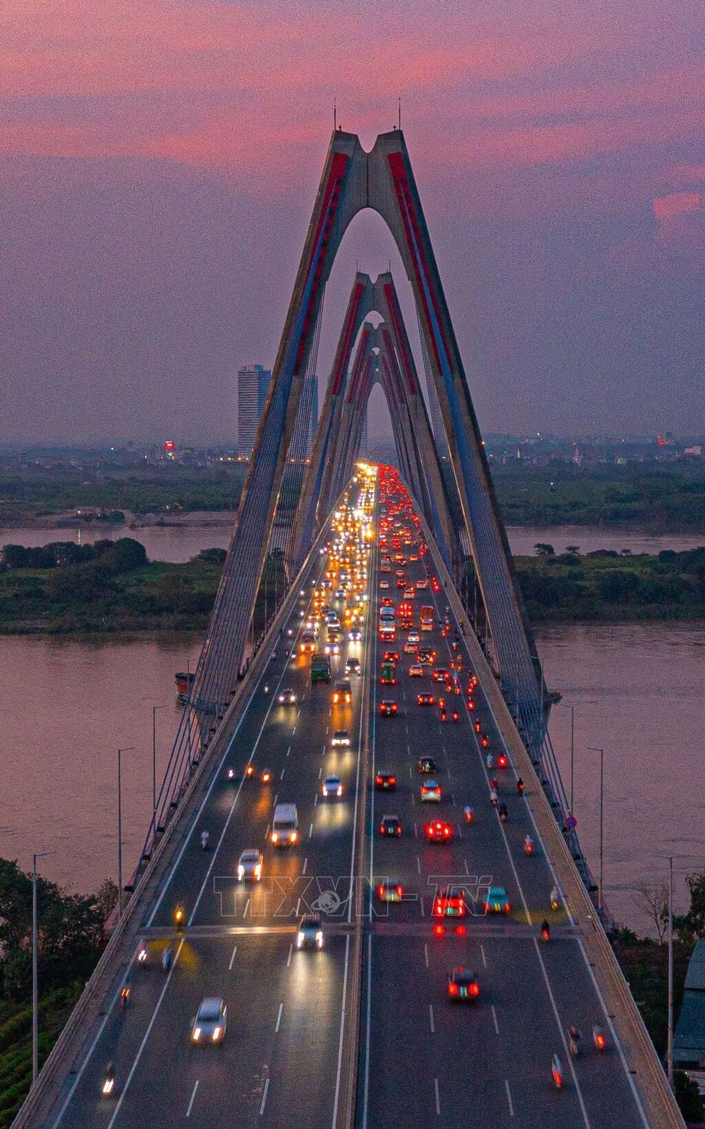 Về đêm với hơn 1.000 đèn LED đổi màu, cầu Nhật Tân khoác lên diện mạo lung linh, như những cánh tay đón chào khách quốc tế. Không gian dưới chân cầu gắn liền với làng đào Nhật Tân - nơi lưu giữ Tết cổ truyền tạo nên sự giao thoa giữa truyền thống và hiện đại, giữa thiên nhiên và công nghệ.