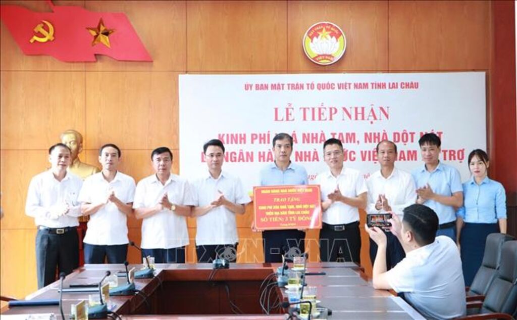 Đại diện lãnh đạo Ngân hàng Nhà nước Chi nhánh Khu vực 3 đã trao hỗ trợ 3 tỷ đồng cho Mặt trận Tổ quốc Việt Nam tỉnh Lai Châu để xóa nhà tạm, nhà dột nát.