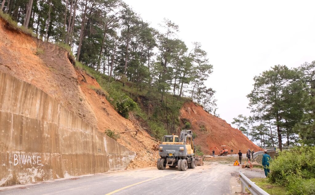 Sáng cùng ngày, phía hai đầu đường qua đoạn sạt lở vẫn được phong tỏa, các phương tiện không được lưu thông. Lực lượng chức năng cùng trang thiết bị, xe cơ giới tiến hành cưa hạ các cây thông ngã đổ tại vị trí sạt lở, san gạt, múc đất đá phía taluy dương tràn ra mặt đường. Tuy nhiên, do khối lượng đất đá sạt lở rất lớn nên công tác giải phóng hiện trường gặp nhiều khó khăn.