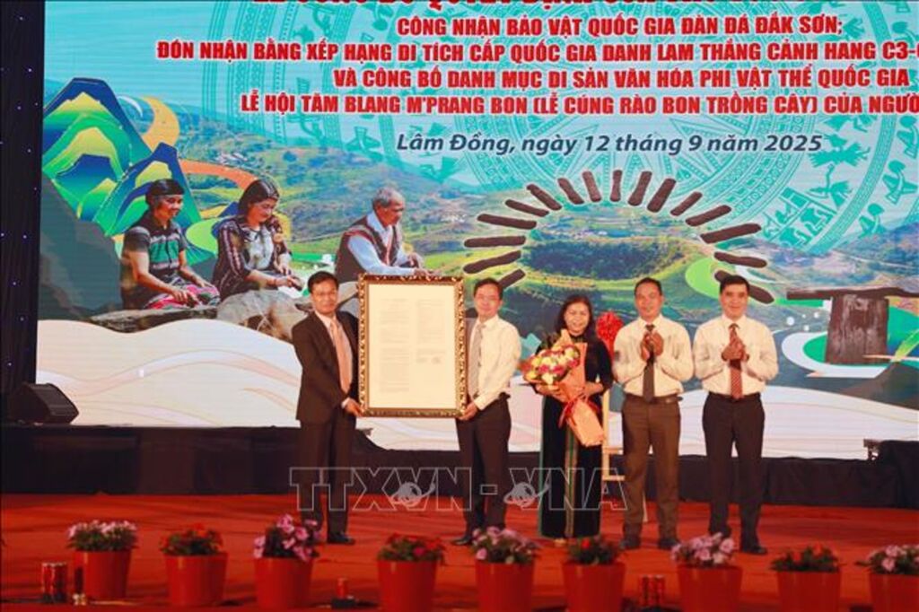 Ngày 12/9, tại phường Đông Gia Nghĩa, UBND tỉnh Lâm Đông tổ chức lễ công bố Quyết định của Thủ tướng Chính phủ công nhận bảo vật quốc gia đàn đá Đắk Sơn; đón nhận bằng xếp hạng di tích cấp quốc gia các danh lam thắng cảnh hang C3 – C4; hang C7; hang C8 và công bố danh mục di sản văn hóa phi vật thể quốc gia lễ hội Tăm Blang M’Prang Bon (lễ cúng rào bon trồng cây) của người M’Nông.
