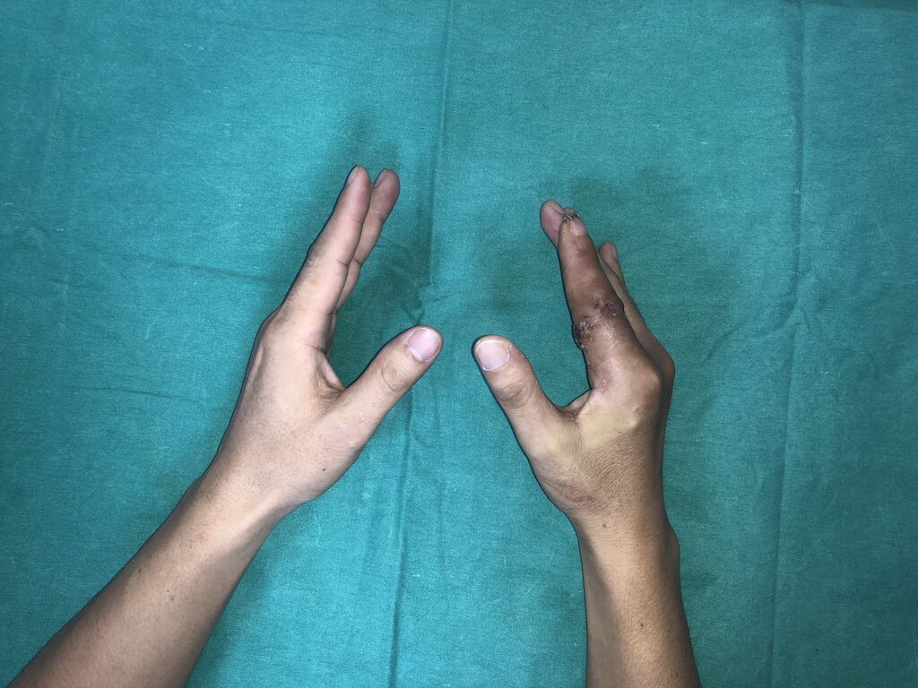 Sau phẫu thuật, vết thương đã liền, ngón tay hồng, sống hoàn toàn, người bệnh đã có thể cắt chỉ và rút kim cố định. Người bệnh đang được tập phục hồi chức năng để lấy lại khả năng vận động và cảm giác của ngón tay.