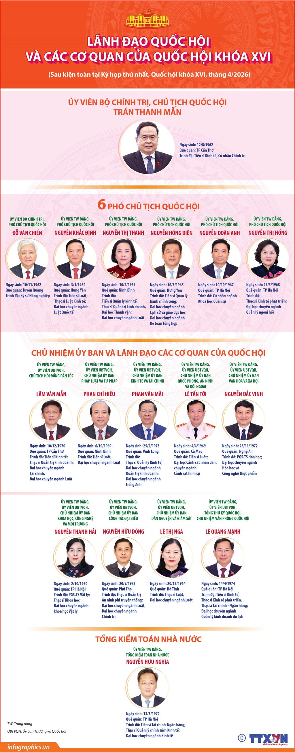 Thứ hai, ngày 6/4/2026, Kỳ họp thứ Nhất, Quốc hội khóa XVI chính thức khai mạc tại Nhà Quốc hội, Thủ đô Hà Nội và bước vào ngày làm việc đầu tiên dưới sự chủ trì của Chủ tịch Quốc hội Trần Thanh Mẫn. -