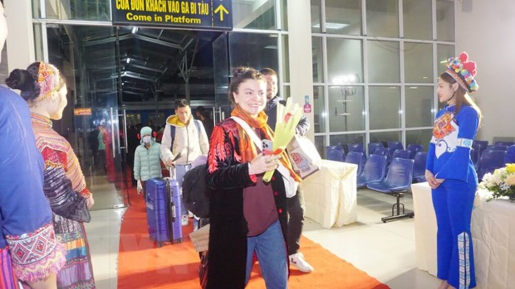 (TTXVN) Sáng 1/1, Sở Du lịch tỉnh Lào Cai phối hợp với Hiệp hội Du lịch, Ga Lào Cai và các đơn vị có liên quan tổ chức đón đoàn du khách quốc tế đầu tiên "xông đất" Lào Cai trong ngày đầu năm mới 2023.